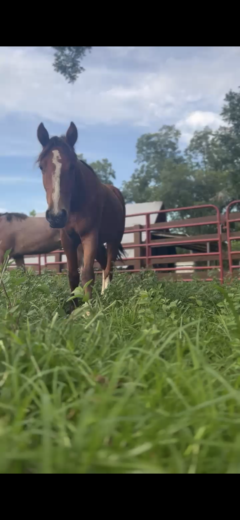 Stark also belongs to Katelyn. He is a 25-year-old Percheron Gelding. Katelyn rescued him in 2021 and has given him his quality of life back. He enjoys his days in the pasture and the occasional trail ride.